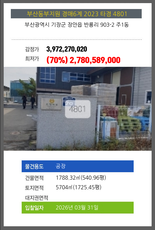 사건번호 2023 타경 4801 본건은 부산광역시 기장군 장안읍 반룡리 903-2 주1동소재하는 공장경매 물건의 포스팅입니다. 건물면적 [ 1788.32㎡ (540.96평) ]토지면적 [ 5704㎡ (1725.45평) ] 시세를 반영한