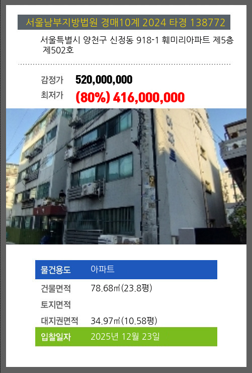 사건번호 2024 타경 138772 본건은 서울특별시 양천구 신정동 918-1 훼미리아파트 제5층 제502호소재하는 아파트경매 물건의 포스팅입니다. 건물면적 [ 78.68㎡ (23.8평) ]대지권 [ 34.97㎡ (10.58평) ] 시세를