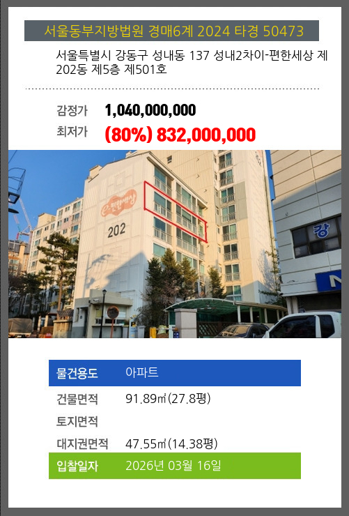 사건번호 2024 타경 50473 본건은 서울특별시 강동구 성내동 137 성내2차이-편한세상 제202동 제5층 제501호소재하는 아파트경매 물건의 포스팅입니다. 건물면적 [ 91.89㎡ (27.8평) ]대지권 [ 47.55㎡ (14.38평) ]