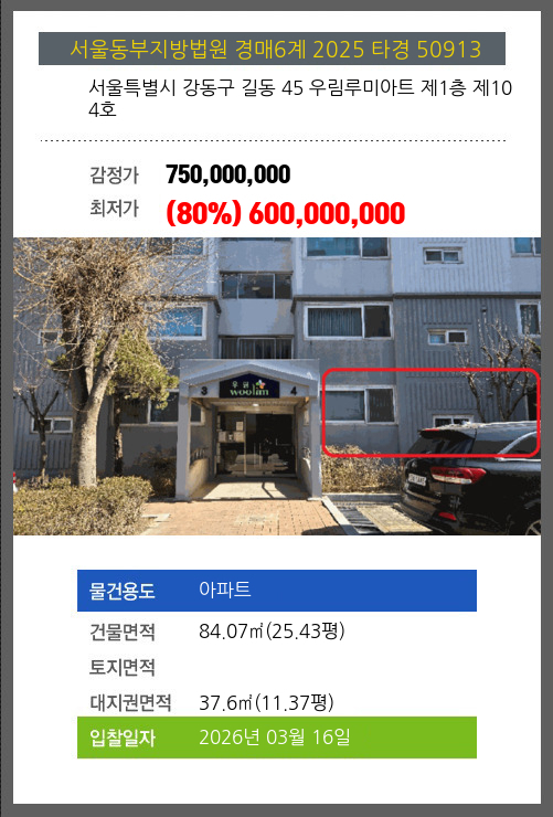 사건번호 2025 타경 50913 본건은 서울특별시 강동구 길동 45 우림루미아트 제1층 제104호소재하는 아파트경매 물건의 포스팅입니다. 건물면적 [ 84.07㎡ (25.43평) ]대지권 [ 37.6㎡ (11.37평) ] 시세를