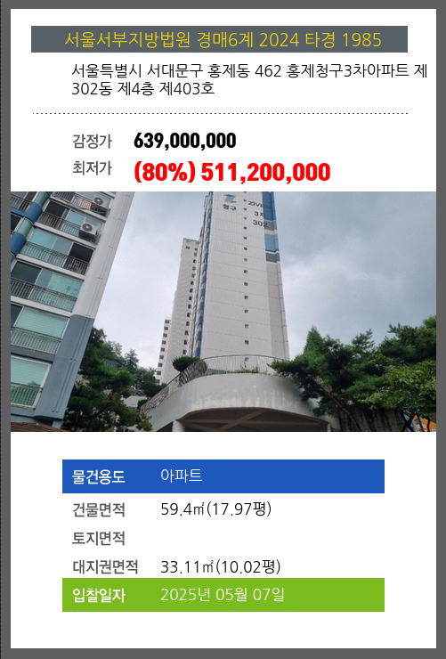 사건번호 2025 타경 51204 본건은 서울특별시 서대문구 홍은동 202-5 현대아파트 제103동 제1층 제102호소재하는 아파트경매 물건의 포스팅입니다. 건물면적 [ 84.77㎡ (25.64평) ]대지권 [ 40.67㎡ (12.3평) ]