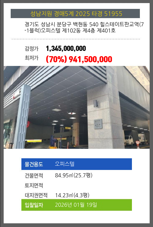 성남오피스텔경매 성남시 분당구 백현동 540 힐스테이트판교역7-1블럭오피스텔 제102동 제4층 제401호 №2025 타경 51955