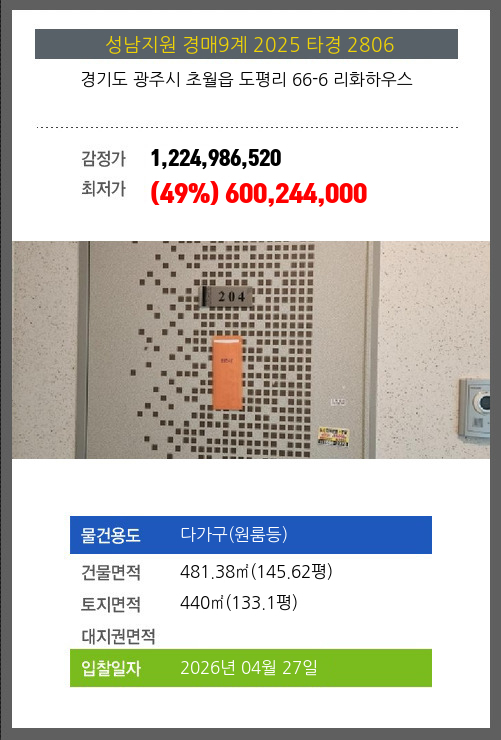 사건번호 2025 타경 2806 본건은 경기도 광주시 초월읍 도평리 66-6 리화하우스소재하는 다가구(원룸등)경매 물건의 포스팅입니다. 건물면적 [ 481.38㎡ (145.62평) ]토지면적 [ 440㎡ (133.1평) ] 시세를 반영한