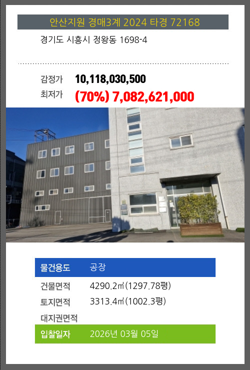 사건번호 2024 타경 71370 본건은 경기도 시흥시 정왕동 1286-12 정왕천서로162 제105동호소재하는 공장경매 물건의 포스팅입니다. 건물면적 [ 491.45㎡ (148.66평) ]토지면적 [ 전체:7807㎡ (2361.7평) 매각지분:630.91㎡ (190.85평) ]