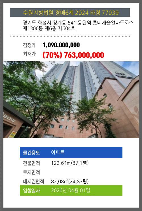사건번호 2024 타경 77039 본건은 경기도 화성시 청계동 541 동탄역 롯데캐슬알바트로스 제1306동 제6층 제604호소재하는 아파트경매 물건의 포스팅입니다. 건물면적 [ 122.64㎡ (37.1평) ]대지권 [ 82.08㎡ (24.83평)