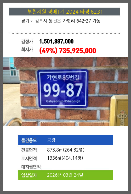 사건번호 2024 타경 6231 본건은 경기도 김포시 통진읍 가현리 642-27 가동소재하는 공장경매 물건의 포스팅입니다. 건물면적 [ 873.8㎡ (264.32평) ]토지면적 [ 1336㎡ (404.14평) ] 시세를 반영한