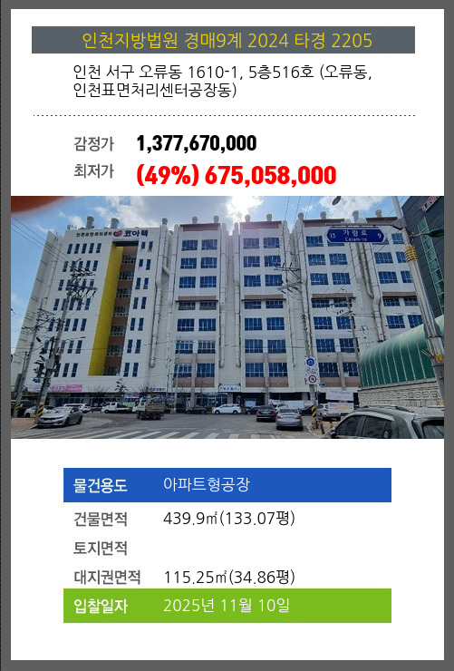 사건번호 2024 타경 2205 본건은 인천 서구 오류동 1610-1, 5층516호 (오류동,인천표면처리센터공장동)소재하는 아파트형공장경매 물건의 포스팅입니다. 건물면적 [ 439.9㎡ (133.07평) ]대지권 [ 115.25㎡ (34.86평) ] 시세를 반영한