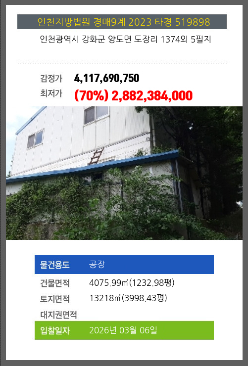 사건번호 2023 타경 519898 본건은 인천광역시 강화군 양도면 도장리 1374외 5필지소재하는 공장경매 물건의 포스팅입니다. 건물면적 [ 4075.99㎡ (1232.98평) ]토지면적 [ 13218㎡ (3998.43평) ] 시세를 반영한
