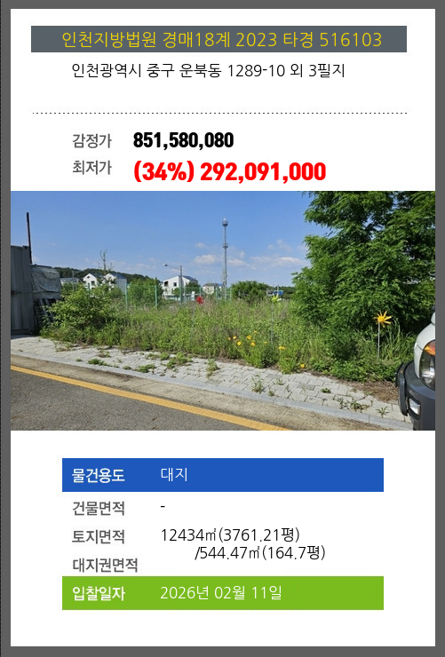사건번호 2023 타경 516103 본건은 인천광역시 중구 운북동 1289-10 외 3필지소재하는 대지경매 물건의 포스팅입니다. 토지면적 [ 전체:12434㎡ (3761.21평) 매각지분:544.47㎡ (164.7평) ] 시세를 반영한 감정가 851,580,080에서3회