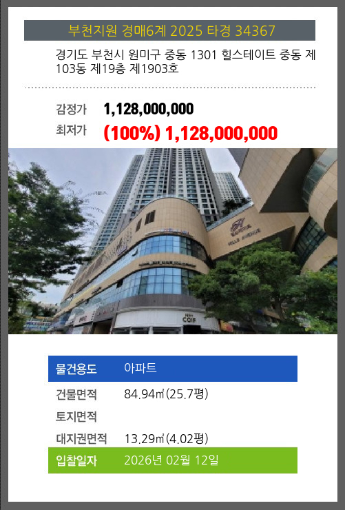 사건번호 2025 타경 34367 본건은 경기도 부천시 원미구 중동 1301 힐스테이트 중동 제103동 제19층 제1903호소재하는 아파트경매 물건의 포스팅입니다. 건물면적 [ 84.94㎡ (25.7평) ]대지권 [ 13.29㎡
