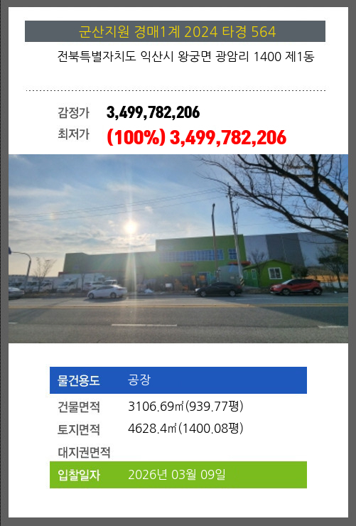 사건번호 2024 타경 564 본건은 전북특별자치도 익산시 왕궁면 광암리 1400 제1동소재하는 공장경매 물건의 포스팅입니다. 건물면적 [ 3106.69㎡ (939.77평) ]토지면적 [ 4628.4㎡ (1400.08평) ] 시세를 반영한