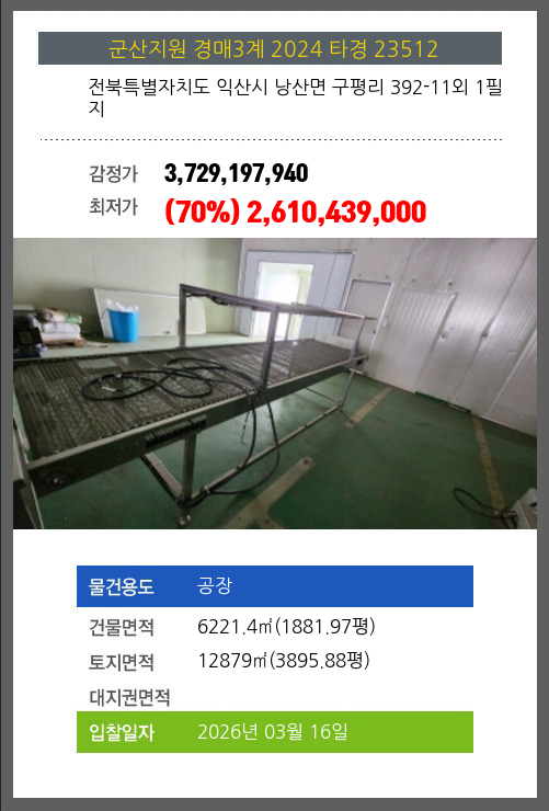 사건번호 2024 타경 23512 본건은 전북특별자치도 익산시 낭산면 구평리 392-11외 1필지소재하는 공장경매 물건의 포스팅입니다. 건물면적 [ 6221.4㎡ (1881.97평) ]토지면적 [ 12879㎡ (3895.88평) ] 시세를 반영한