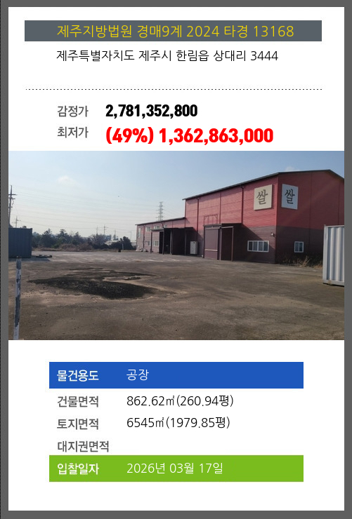 사건번호 2024 타경 13168 본건은 제주특별자치도 제주시 한림읍 상대리 3444소재하는 공장경매 물건의 포스팅입니다. 건물면적 [ 862.62㎡ (260.94평) ]토지면적 [ 6545㎡ (1979.85평) ] 시세를 반영한 감정가