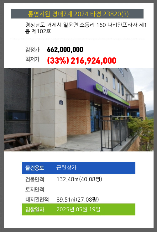 사건번호 2024 타경 3666 본건은 경상남도 거제시 옥포동 546-33소재하는 근린주택경매 물건의 포스팅입니다. 건물면적 [ 1059.86㎡ (320.61평) ]토지면적 [ 355.2㎡ (107.45평) ] 시세를 반영한 감정가 1,534,200,580에서3회