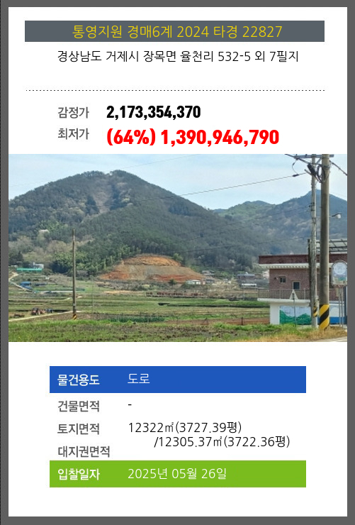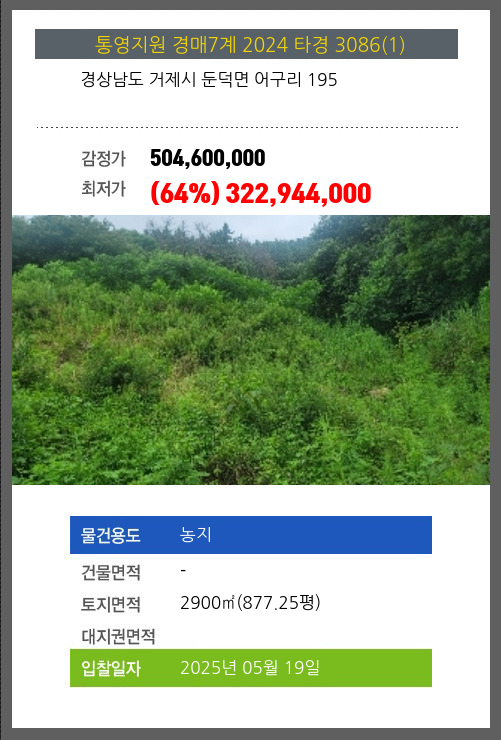 사건번호 2024 타경 5051 본건은 경상남도 거제시 장목면 외포리 387-6 외 4필지소재하는 임야경매 물건의 포스팅입니다. 건물면적 [ 토지만매각 ]토지면적 [ 9612㎡ (2907.62평) ] 시세를 반영한
