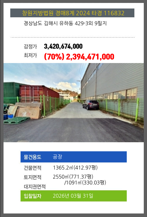 사건번호 2024 타경 116832 본건은 경상남도 김해시 유하동 429-3외 9필지소재하는 공장경매 물건의 포스팅입니다. 건물면적 [ 1365.2㎡ (412.97평) ]토지면적 [ 전체:2550㎡ (771.37평) 매각지분:1091㎡ (330.03평) ] 시세를