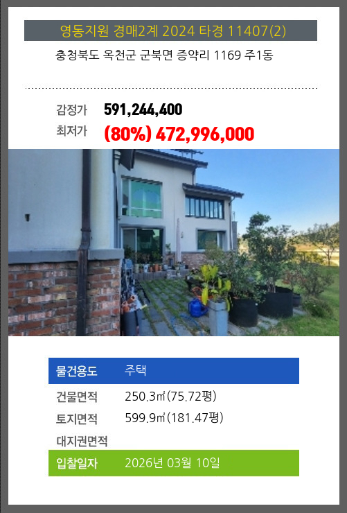 사건번호 2024 타경 11407(2) 본건은 충청북도 옥천군 군북면 증약리 1169 주1동소재하는 주택경매 물건의 포스팅입니다. 건물면적 [ 250.3㎡ (75.72평) ]토지면적 [ 599.9㎡ (181.47평) ] 시세를 반영한