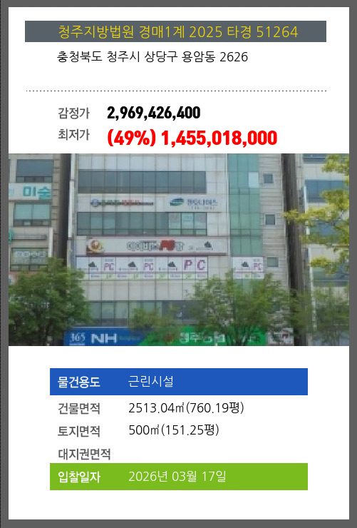 사건번호 2025 타경 51264 본건은 충청북도 청주시 상당구 용암동 2626소재하는 근린시설경매 물건의 포스팅입니다. 건물면적 [ 2513.04㎡ (760.19평) ]토지면적 [ 500㎡ (151.25평) ] 시세를 반영한 감정가