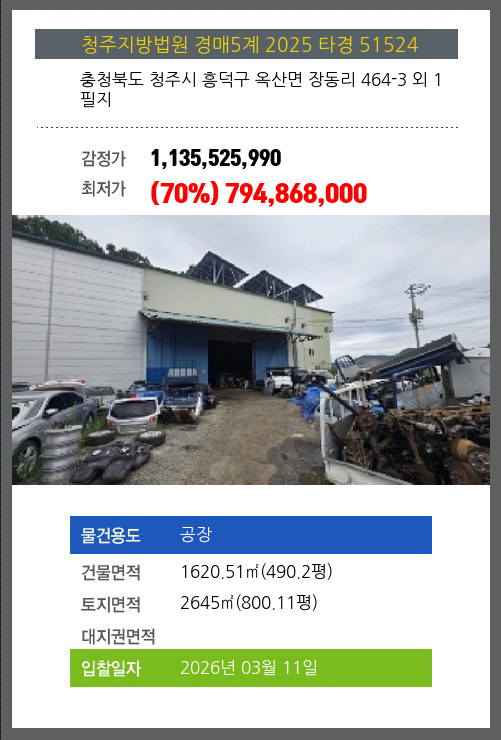 사건번호 2025 타경 51524 본건은 충청북도 청주시 흥덕구 옥산면 장동리 464-3 외 1필지소재하는 공장경매 물건의 포스팅입니다. 건물면적 [ 1620.51㎡ (490.2평) ]토지면적 [ 2645㎡ (800.11평) ]