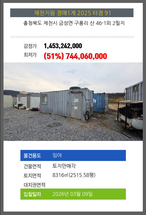 사건번호 2025 타경 51369 본건은 충청북도 괴산군 문광면 광덕리 595-2외 9필지소재하는 공장경매 물건의 포스팅입니다. 건물면적 [ 5345.22㎡ (1616.92평) ]토지면적 [ 13469㎡ (4074.35평) ] 시세를 반영한