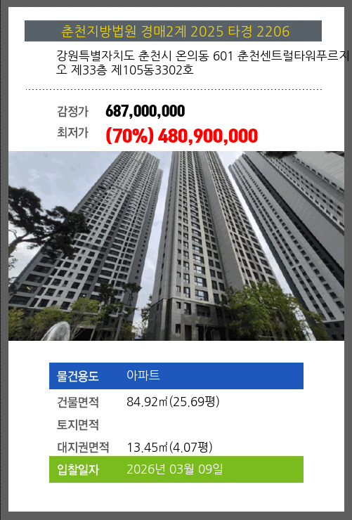 사건번호 2025 타경 2206 본건은 강원특별자치도 춘천시 온의동 601 춘천센트럴타워푸르지오 제33층 제105동3302호소재하는 아파트경매 물건의 포스팅입니다. 건물면적 [ 84.92㎡ (25.69평) ]대지권 [ 13.45㎡ (4.07평) ] 시세를
