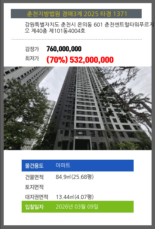 사건번호 2025 타경 1371 본건은 강원특별자치도 춘천시 온의동 601 춘천센트럴타워푸르지오 제40층 제101동4004호소재하는 아파트경매 물건의 포스팅입니다. 건물면적 [ 84.9㎡ (25.68평) ]대지권 [ 13.44㎡ (4.07평) ] 시세를