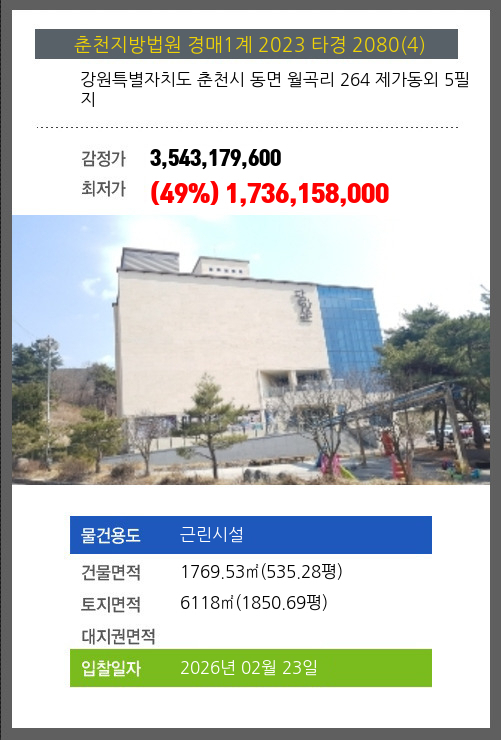 사건번호 2023 타경 2080(4) 본건은 강원특별자치도 춘천시 동면 월곡리 264 제가동외 5필지소재하는 근린시설경매 물건의 포스팅입니다. 건물면적 [ 1769.53㎡ (535.28평) ]토지면적 [ 6118㎡ (1850.69평) ] 시세를
