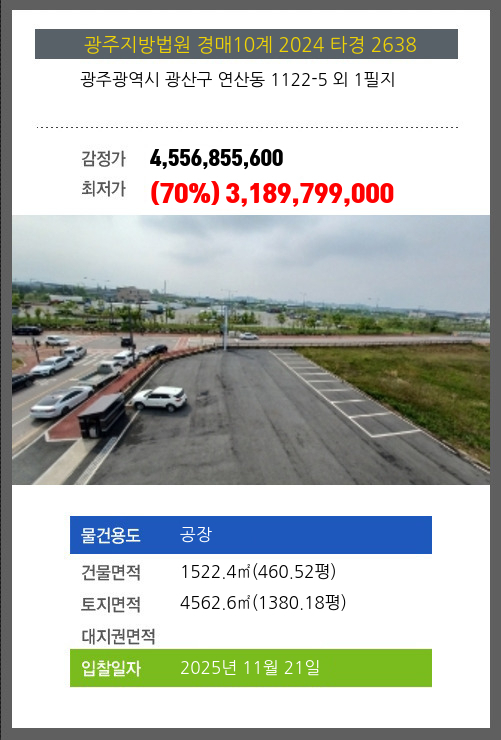 사건번호 2024 타경 2638 본건은 광주광역시 광산구 연산동 1122-5 외 1필지소재하는 공장경매 물건의 포스팅입니다. 건물면적 [ 1522.4㎡ (460.52평) ]토지면적 [ 4562.6㎡ (1380.18평) ] 시세를 반영한