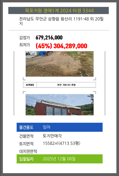 사건번호 2024 타경 3344 본건은 전라남도 무안군 삼향읍 왕산리 1191-48 외 20필지소재하는 임야경매 물건의 포스팅입니다. 건물면적 [ 토지만매각 ]토지면적 [ 15582㎡ (4713.53평) ] 시세를 반영한
