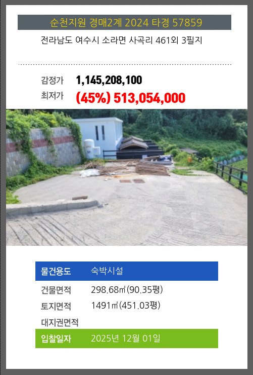 사건번호 2024 타경 57859 본건은 전라남도 여수시 소라면 사곡리 461외 3필지소재하는 숙박시설경매 물건의 포스팅입니다. 건물면적 [ 298.68㎡ (90.35평) ]토지면적 [ 1491㎡ (451.03평) ] 시세를 반영한
