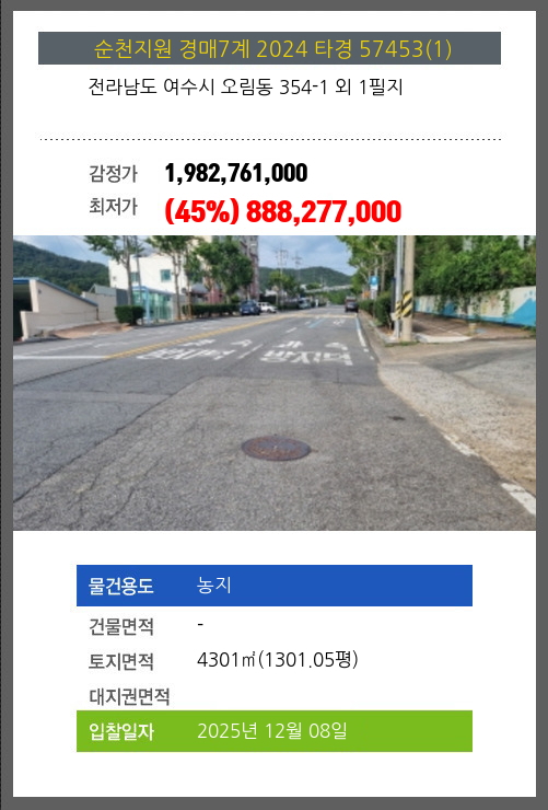 사건번호 2024 타경 57453(1) 본건은 전라남도 여수시 오림동 354-1 외 1필지소재하는 농지경매 물건의 포스팅입니다. 토지면적 [ 4301㎡ (1301.05평) ] 시세를 반영한 감정가 1,982,761,000에서3회 유찰되어 감정가
