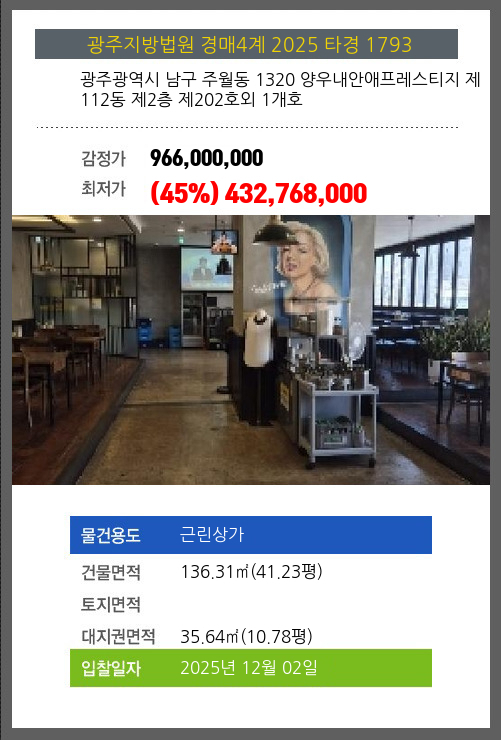 사건번호 2025 타경 1793 본건은 광주광역시 남구 주월동 1320 양우내안애프레스티지 제112동 제2층 제202호외 1개호소재하는 근린상가경매 물건의 포스팅입니다. 건물면적 [ 136.31㎡ (41.23평) ]대지권 [ 35.64㎡ (10.78평)