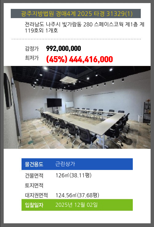사건번호 2025 타경 31329(1) 본건은 전라남도 나주시 빛가람동 280 스페이스코웍 제1층 제119호외 1개호소재하는 근린상가경매 물건의 포스팅입니다. 건물면적 [ 126㎡ (38.11평) ]대지권 [ 124.56㎡ (37.68평) ]