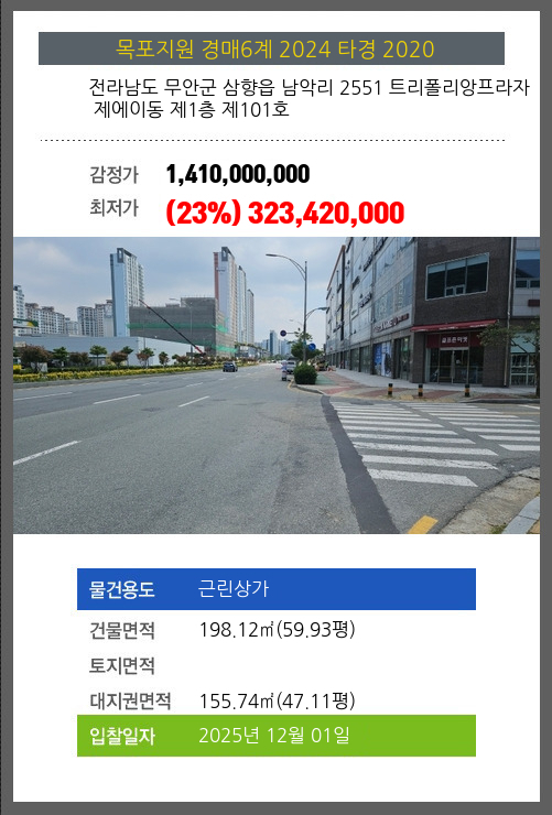 사건번호 2024 타경 2020 본건은 전라남도 무안군 삼향읍 남악리 2551 트리폴리앙프라자 제에이동 제1층 제101호소재하는 근린상가경매 물건의 포스팅입니다. 건물면적 [ 198.12㎡ (59.93평) ]대지권 [ 155.74㎡ (47.11평)