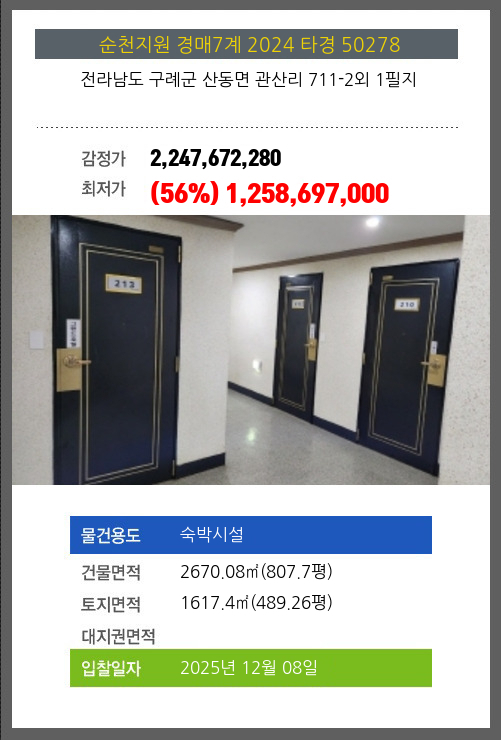 사건번호 2024 타경 50278 본건은 전라남도 구례군 산동면 관산리 711-2외 1필지소재하는 숙박시설경매 물건의 포스팅입니다. 건물면적 [ 2670.08㎡ (807.7평) ]토지면적 [ 1617.4㎡ (489.26평) ] 시세를 반영한