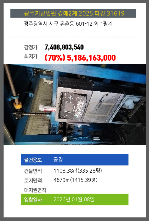 사건번호 2025 타경 31619 본건은 광주광역시 서구 유촌동 601-12 외 1필지소재하는 공장경매 물건의 포스팅입니다. 건물면적 [ 1108.38㎡ (335.28평) ]토지면적 [ 4679㎡ (1415.39평) ] 시세를 반영한