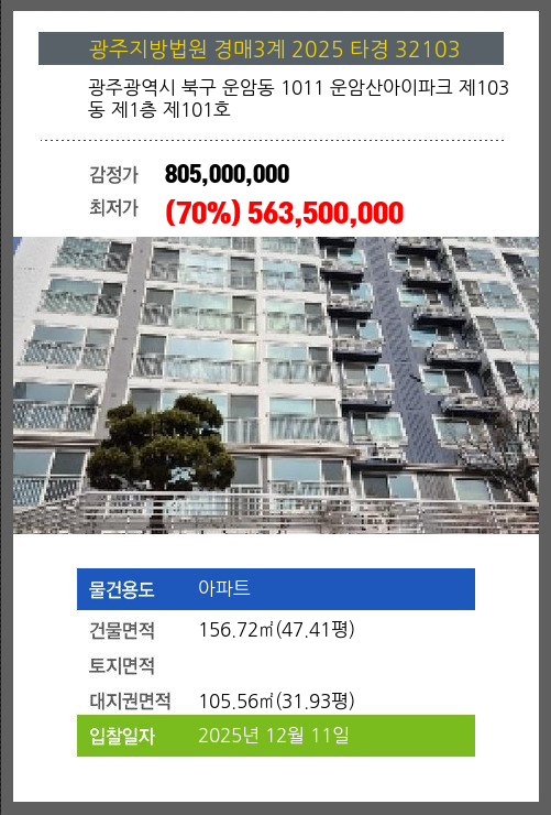 사건번호 2025 타경 32103 본건은 광주광역시 북구 운암동 1011 운암산아이파크 제103동 제1층 제101호소재하는 아파트경매 물건의 포스팅입니다. 건물면적 [ 156.72㎡ (47.41평) ]대지권 [ 105.56㎡ (31.93평) ]