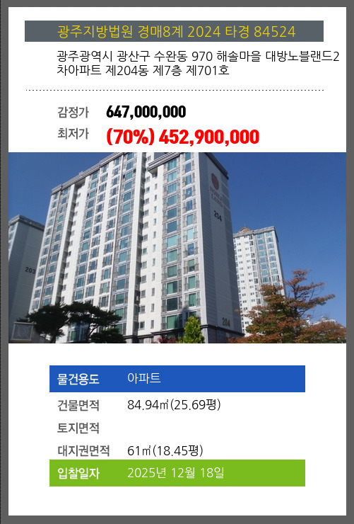 사건번호 2024 타경 84524 본건은 광주광역시 광산구 수완동 970 해솔마을 대방노블랜드2차아파트 제204동 제7층 제701호소재하는 아파트경매 물건의 포스팅입니다. 건물면적 [ 84.94㎡ (25.69평) ]대지권 [ 61㎡ (18.45평)