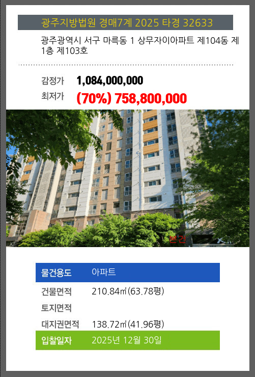 사건번호 2025 타경 32633 본건은 광주광역시 서구 마륵동 1 상무자이아파트 제104동 제1층 제103호소재하는 아파트경매 물건의 포스팅입니다. 건물면적 [ 210.84㎡ (63.78평) ]대지권 [ 138.72㎡ (41.96평) ]