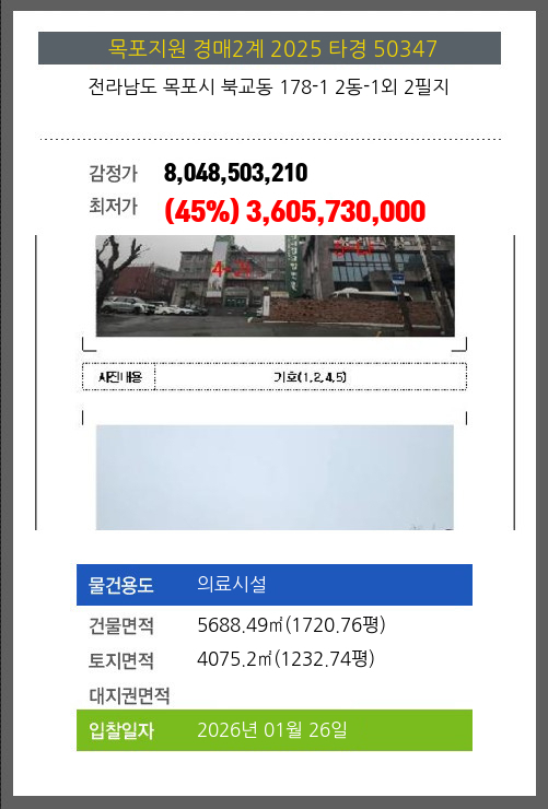 사건번호 2025 타경 50347 본건은 전라남도 목포시 북교동 178-1 2동-1외 2필지소재하는 의료시설경매 물건의 포스팅입니다. 건물면적 [ 5688.49㎡ (1720.76평) ]토지면적 [ 4075.2㎡ (1232.74평) ] 시세를 반영한