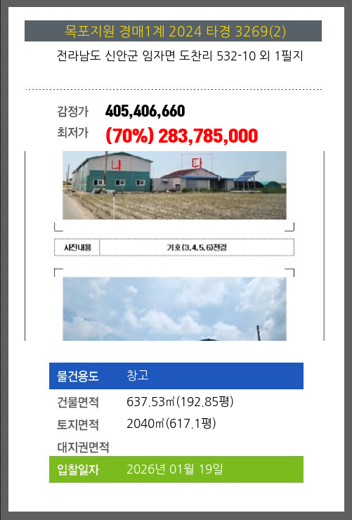 사건번호 2024 타경 3269(2) 본건은 전라남도 신안군 임자면 도찬리 532-10 외 1필지소재하는 창고경매 물건의 포스팅입니다. 건물면적 [ 637.53㎡ (192.85평) ]토지면적 [ 2040㎡ (617.1평) ] 시세를