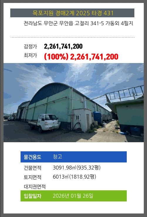 사건번호 2025 타경 431 본건은 전라남도 무안군 무안읍 고절리 341-5 가동외 4필지소재하는 창고경매 물건의 포스팅입니다. 건물면적 [ 3091.98㎡ (935.32평) ]토지면적 [ 6013㎡ (1818.92평) ] 시세를