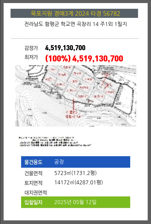사건번호 2024 타경 56782 본건은 전라남도 함평군 학교면 곡창리 14 주1외 1필지소재하는 공장경매 물건의 포스팅입니다. 건물면적 [ 5723㎡ (1731.2평) ]토지면적 [ 14172㎡ (4287.01평) ] 시세를