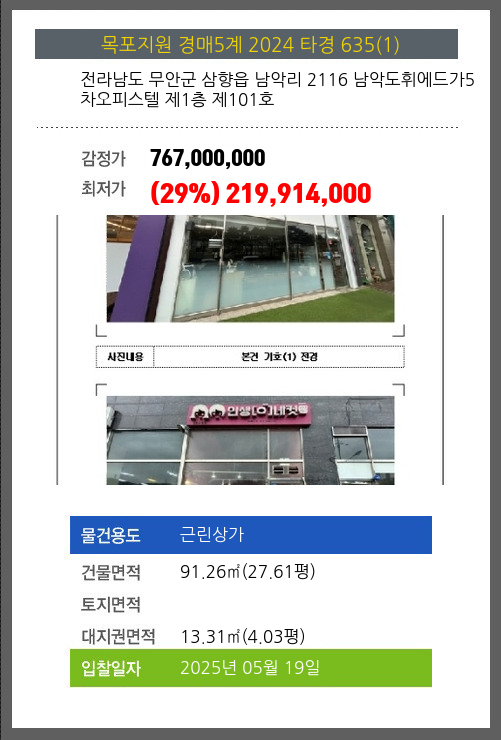사건번호 2024 타경 635(1) 본건은 전라남도 무안군 삼향읍 남악리 2116 남악도휘에드가5차오피스텔 제1층 제101호소재하는 근린상가경매 물건의 포스팅입니다. 건물면적 [ 91.26㎡ (27.61평) ]대지권 [ 13.31㎡ (4.03평) ]