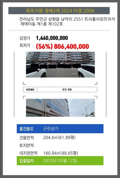 사건번호 2024 타경 2006 본건은 전라남도 무안군 삼향읍 남악리 2551 트리폴리앙프라자 제에이동 제1층 제102호소재하는 근린상가경매 물건의 포스팅입니다. 건물면적 [ 204.6㎡ (61.89평) ]대지권 [ 160.84㎡ (48.65평)