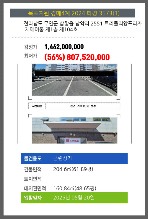 사건번호 2024 타경 3573(1) 본건은 전라남도 무안군 삼향읍 남악리 2551 트리폴리앙프라자 제에이동 제1층 제104호소재하는 근린상가경매 물건의 포스팅입니다. 건물면적 [ 204.6㎡ (61.89평) ]대지권 [ 160.84㎡ (48.65평)