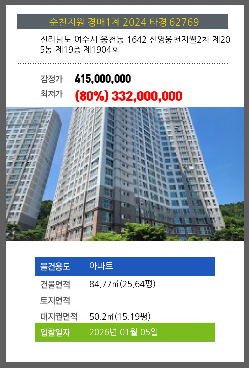 사건번호 2024 타경 62769 본건은 전라남도 여수시 웅천동 1642 신영웅천지웰2차 제205동 제19층 제1904호소재하는 아파트경매 물건의 포스팅입니다. 건물면적 [ 84.77㎡ (25.64평) ]대지권 [ 50.2㎡ (15.19평) ]