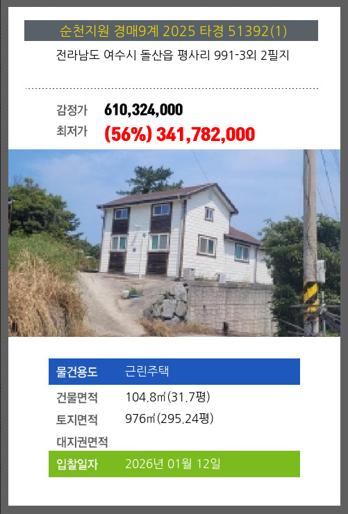 사건번호 2025 타경 51392(1) 본건은 전라남도 여수시 돌산읍 평사리 991-3외 2필지소재하는 근린주택경매 물건의 포스팅입니다. 건물면적 [ 104.8㎡ (31.7평) ]토지면적 [ 976㎡ (295.24평) ] 시세를 반영한