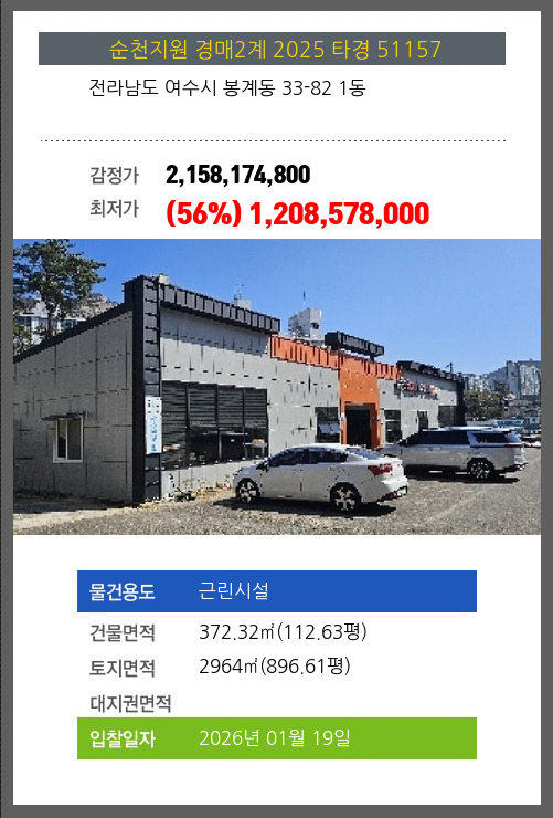 사건번호 2025 타경 51157 본건은 전라남도 여수시 봉계동 33-82 1동소재하는 근린시설경매 물건의 포스팅입니다. 건물면적 [ 372.32㎡ (112.63평) ]토지면적 [ 2964㎡ (896.61평) ] 시세를 반영한 감정가