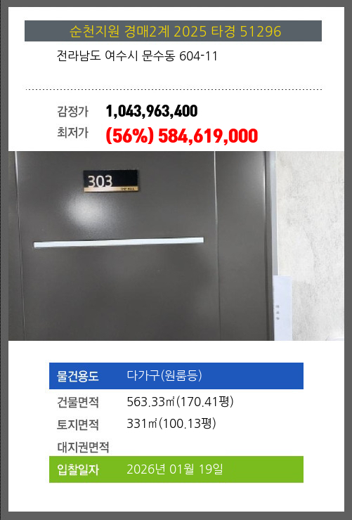 사건번호 2025 타경 51296 본건은 전라남도 여수시 문수동 604-11소재하는 다가구(원룸등)경매 물건의 포스팅입니다. 건물면적 [ 563.33㎡ (170.41평) ]토지면적 [ 331㎡ (100.13평) ] 시세를 반영한 감정가 1,043,963,400에서2회
